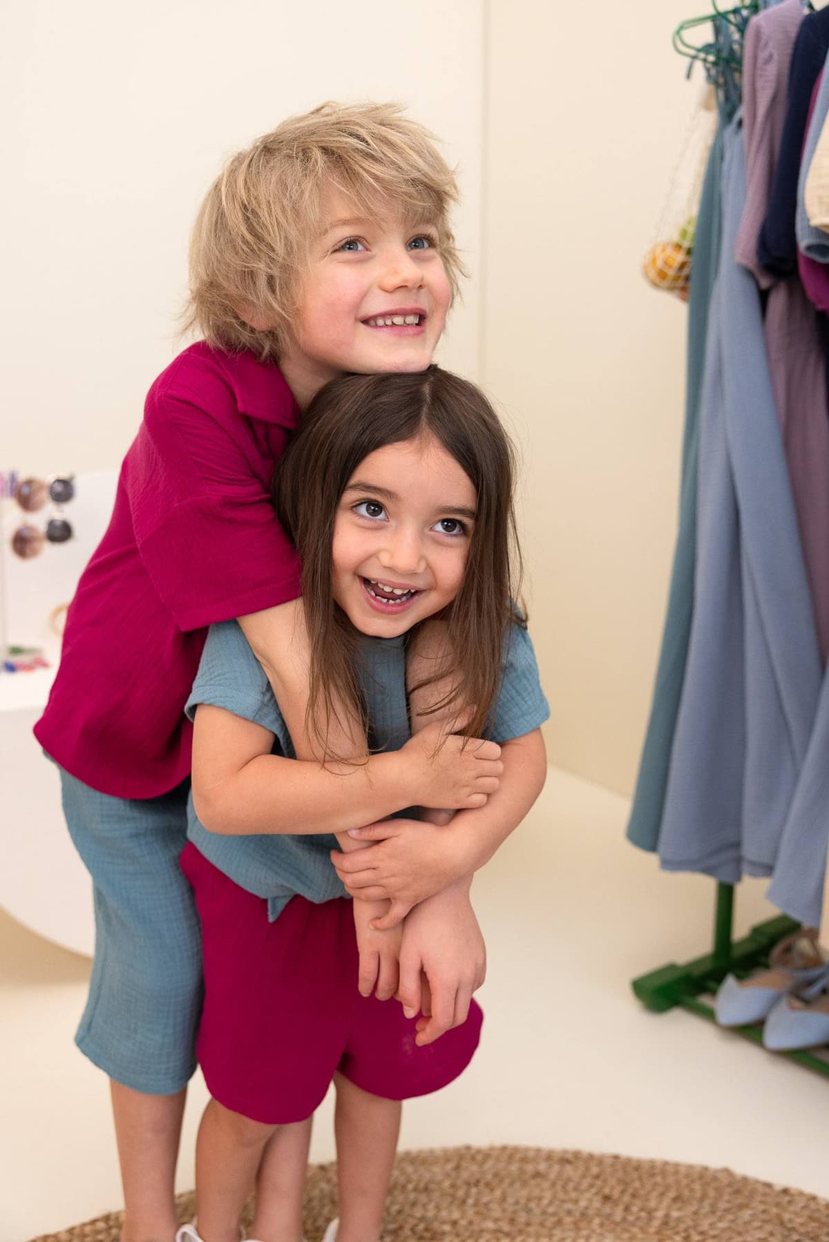 Max went for a muslin monochrome look—polo shirt and trousers—while Agata chose a flowy berry-toned muslin dress. Add must-have summer hats, and they were all set for sunny adventures!